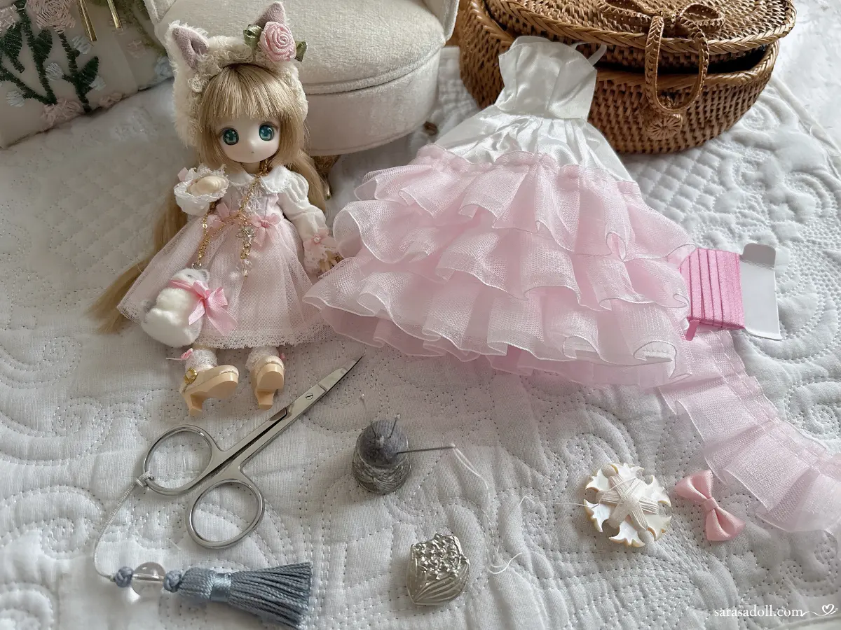 ドール趣味の楽しみの一つは「自分で作る」こと!  1/12サイズはドール服もアクセサリーも小さくて作りやすいので、私の基準にぴったりでした。  ハギレ1枚で数着作れるし、失敗してもダメージが少ないんです。